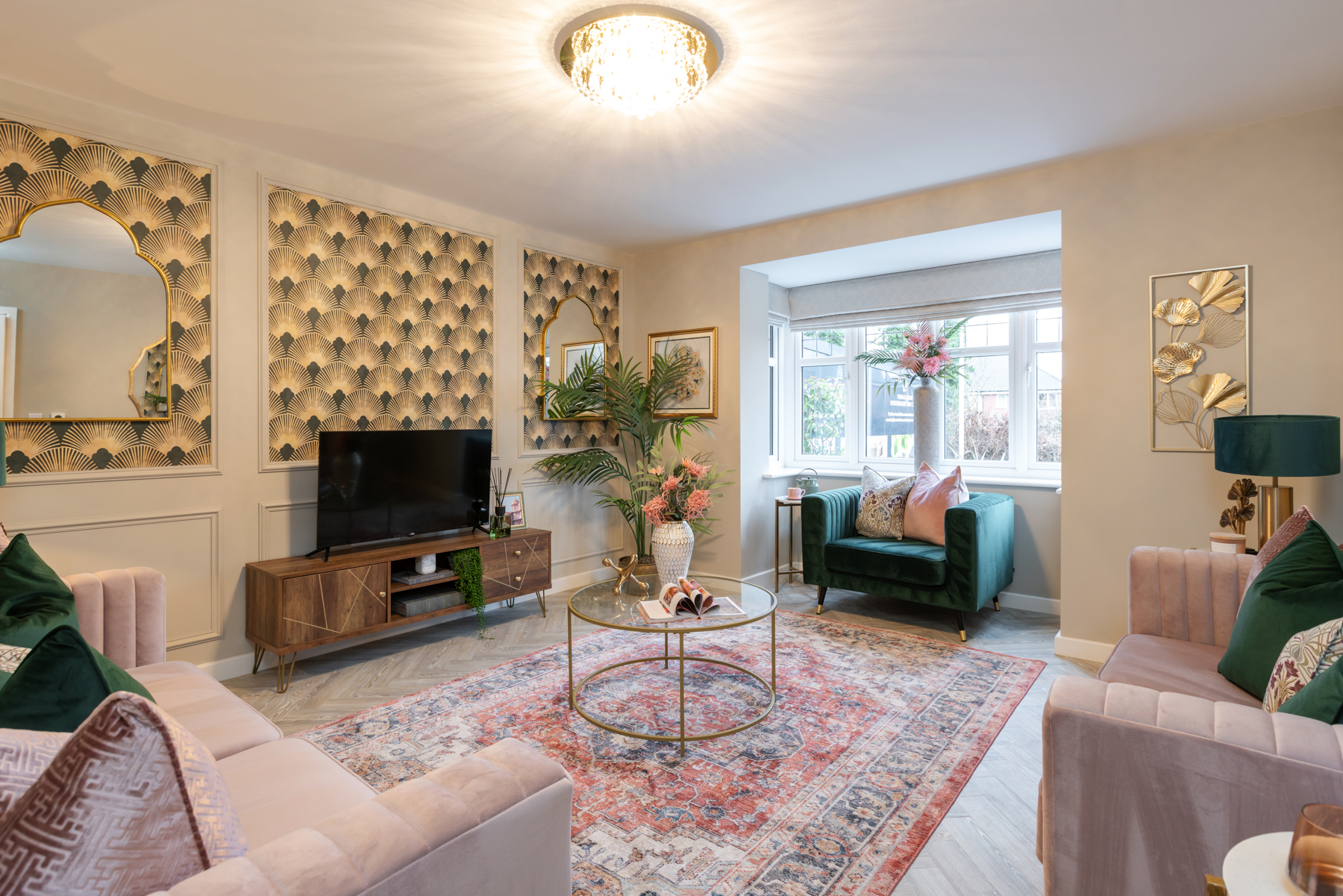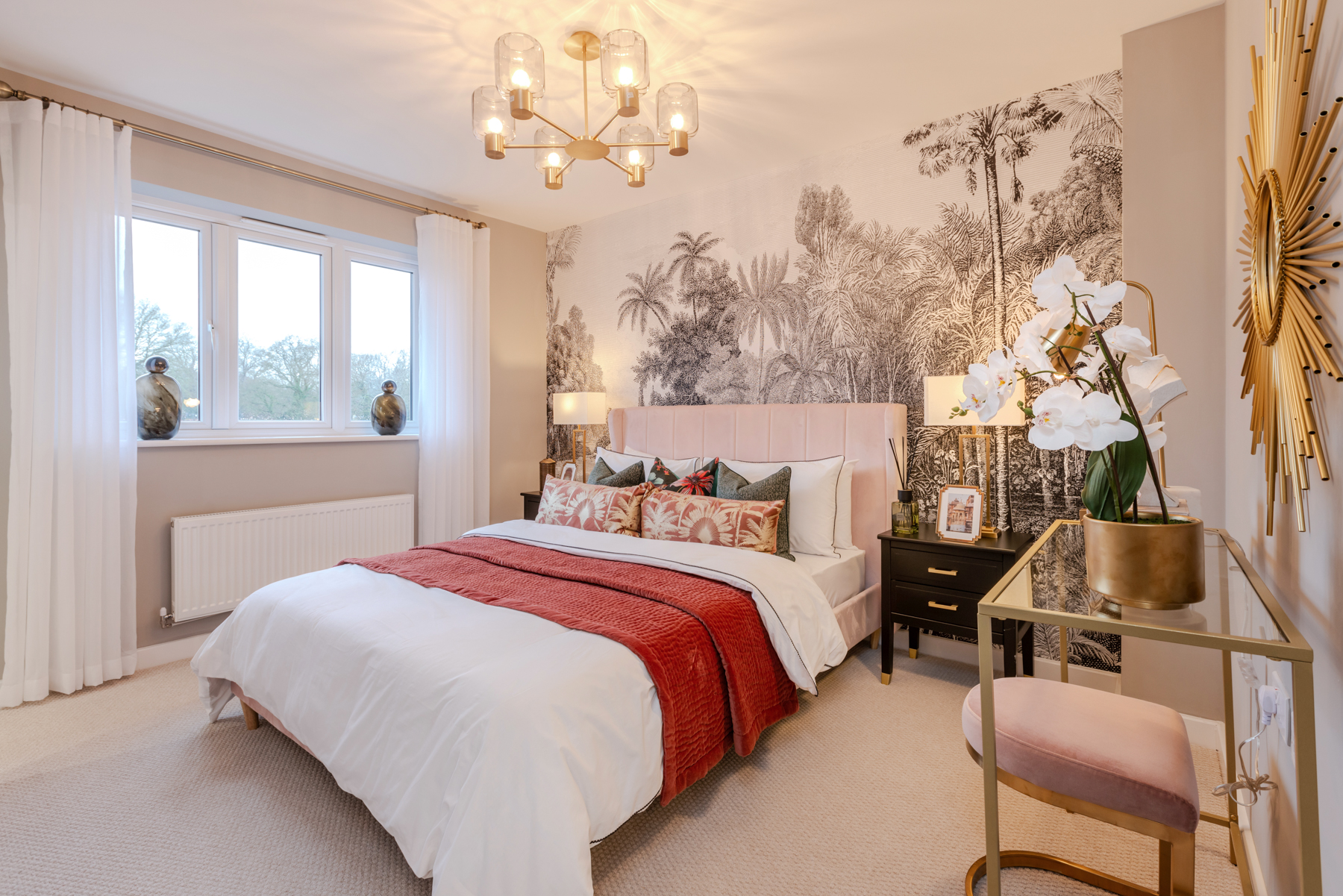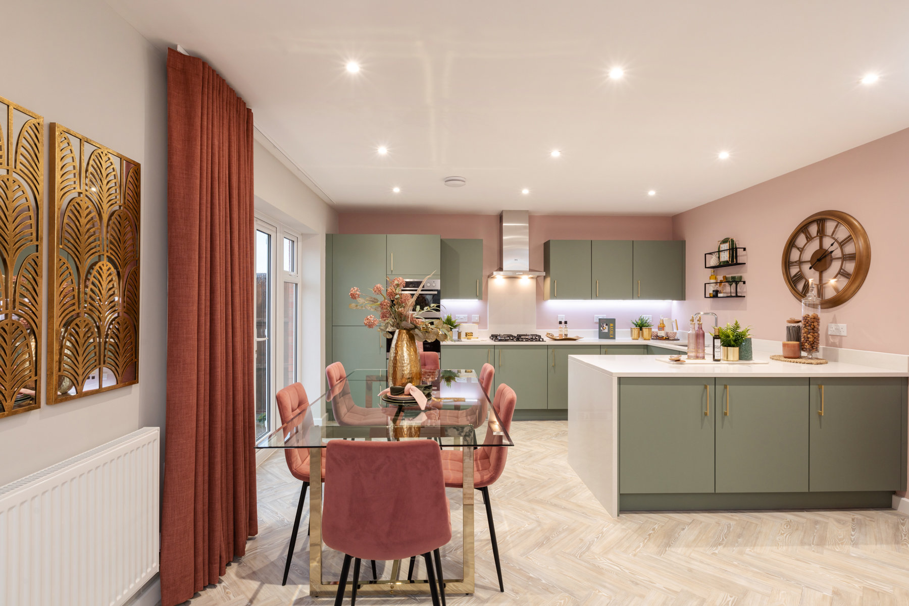 “Our customers absolutely adore this scheme,” says Bloor Homes’ sales manager, Tiggy Garner Jones. “They find it warm, welcoming and love the open plan living. The green kitchen is always a standout talking point, as are some of the beautiful wallpapers. People seem to enjoy discovering how they can bring bold design into unexpected places; the downstairs cloakroom and living room panelling are both great examples of this. Of course, our younger house hunters also love the space themed bedroom with its starry painted ceiling.